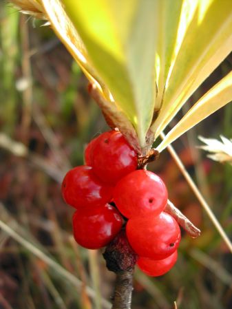 Noch während der Blüte entfalten sich die kleinen länglichen Blätter und schon im Sommer trägt die Pflanze hochrote Beeren.