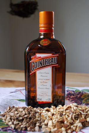 Eine Mischung aus Kalmusrhizomen und Pomeranzenschalen (Bitterorangenschalen) wird in Cointreau eingelegt: